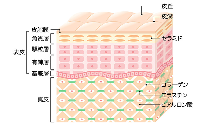 肌は「表皮層」「真皮層」「皮下組織」の3層構造になっています。その中で乾燥小じわができる角質層は「表皮層」にあたる層です。