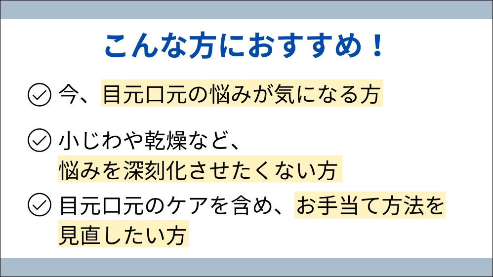 皮膚が薄く様々なダメージを受けやすい目元口元。本格的な夏が来る前に早いうちから集中的なケアが大切!自信の持てる目元口元へ、「目もと口もと贅沢ケア プレミアムきわめ」を使ったお手当て方法や、その魅力を社員が実践しながらお伝えします。ご愛用いただいているお客様の口コミもご紹介いたしますので、まだ使ったことのない方は必見です。