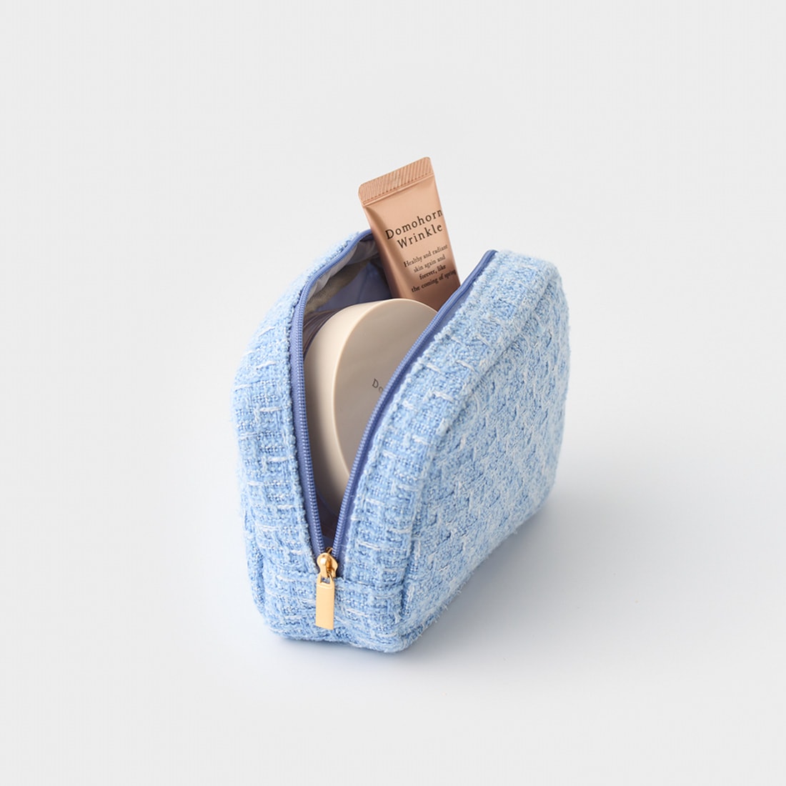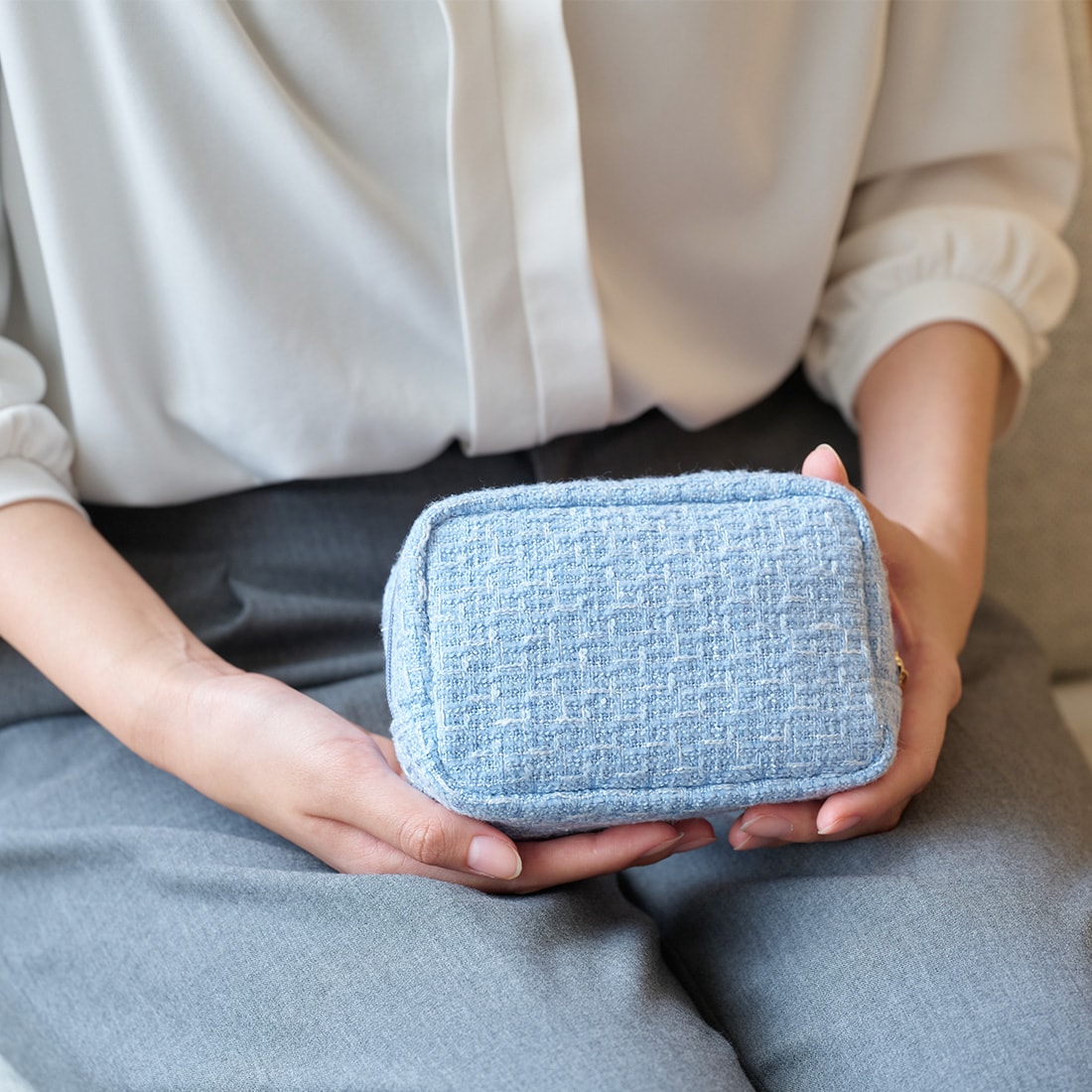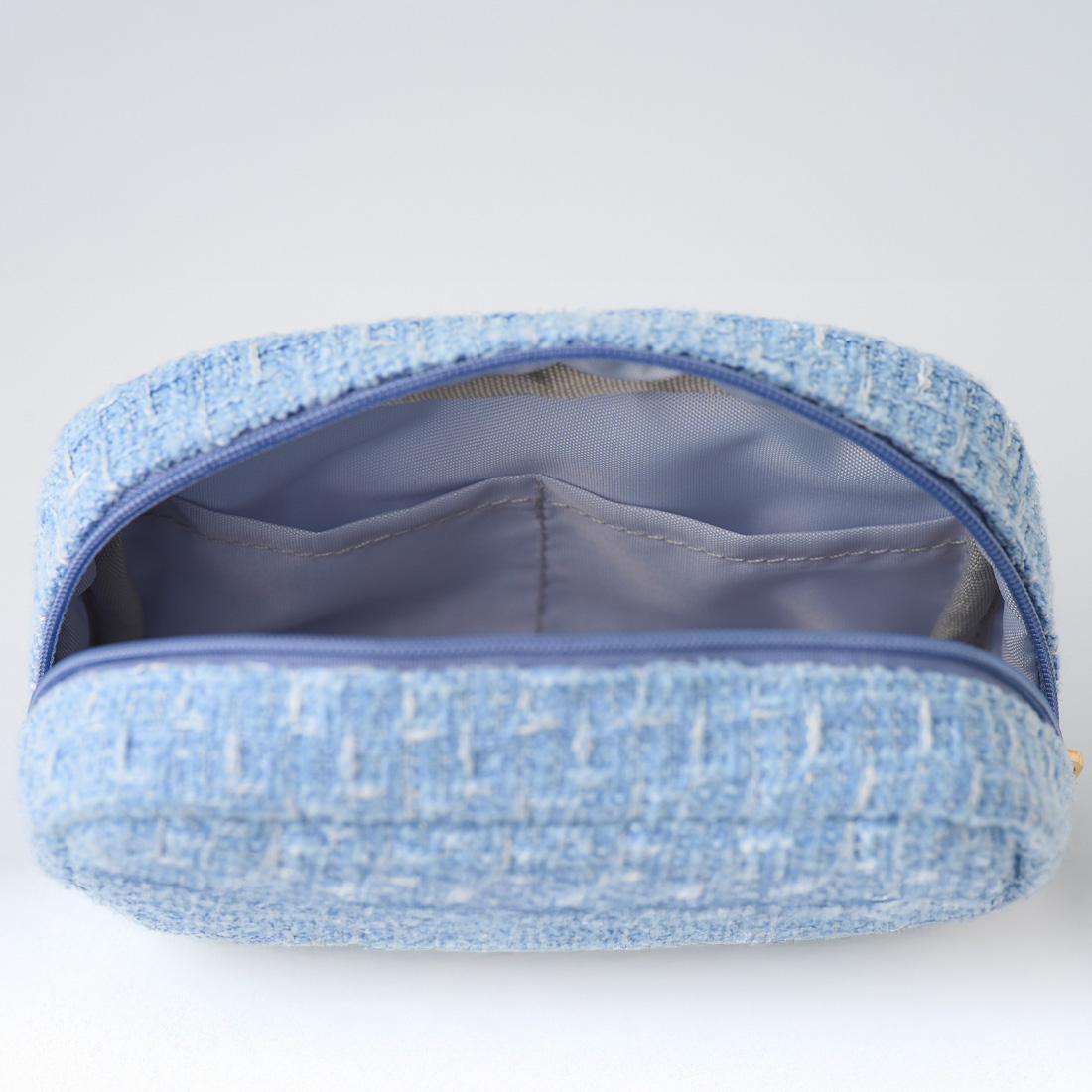 目を引く鮮やかなブルーのツイード生地を採用し、上品で華やかなデザインに仕上げました。ツイードならではの柔らかな質感と高級感が、バッグの中をぱっと明るく演出します。