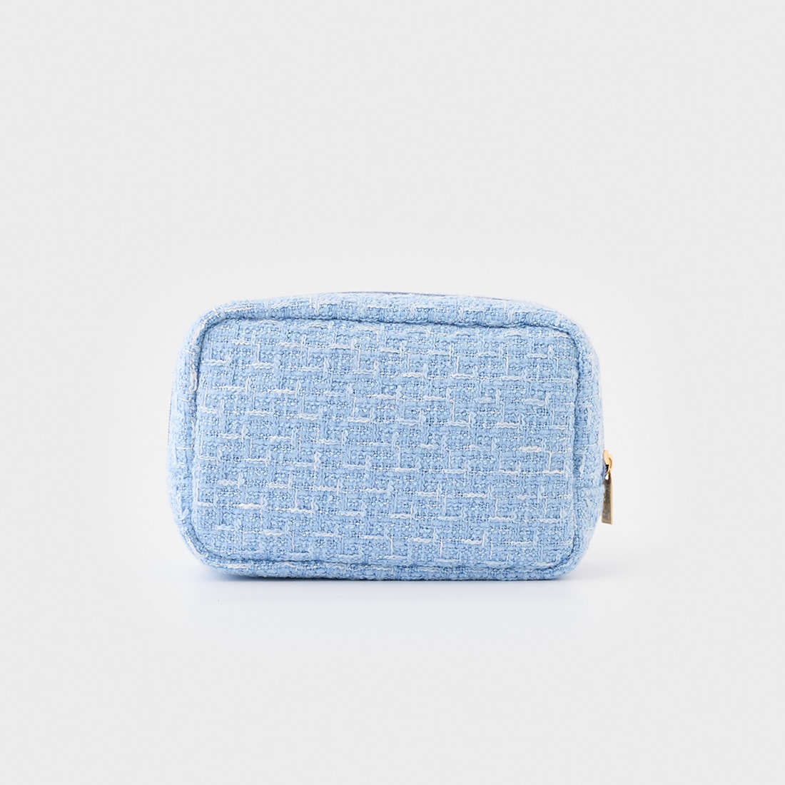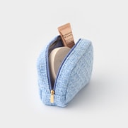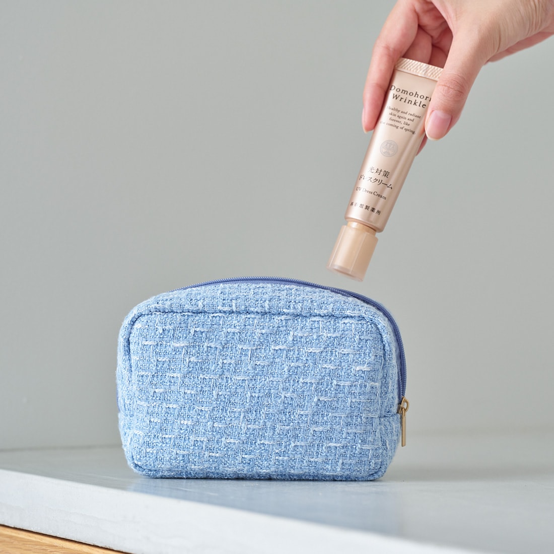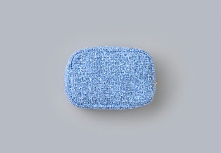 目を引く鮮やかなブルーのツイード生地を採用し、上品で華やかなデザインに仕上げました。ツイードならではの柔らかな質感と高級感が、バッグの中をぱっと明るく演出します。