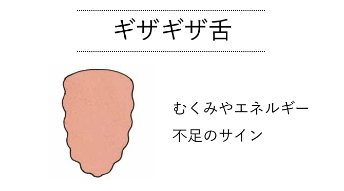 分厚く締まりがなく、舌の輪郭が歯形でギザギザしていたら水分の過剰摂取やエネルギー不足でむくんでいる可能性が。巡りの改善を。