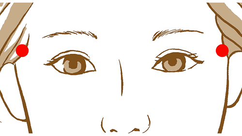 眉尻と目尻をつなぐ線の中央から外側にたどって行き、くぼんでいるところ。