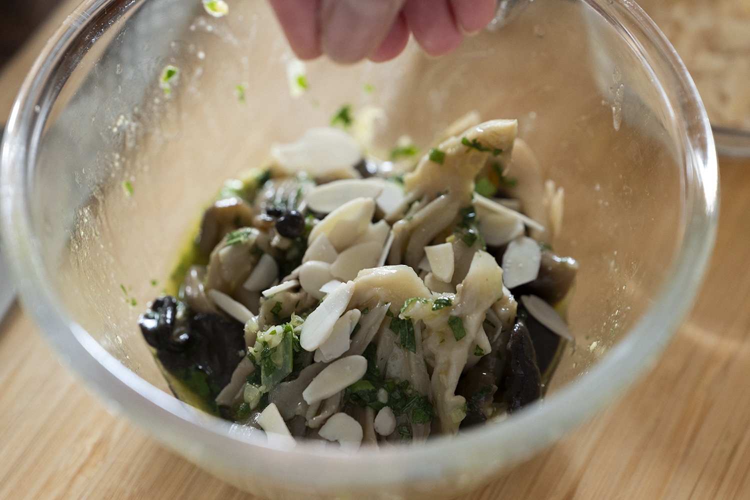 ❹キノコ類に❸を合わせ、すりつぶした松の実と大葉も最後に混ぜ合わせる。最後に塩で味を整える。お好みでアーモンドやピーナッツなどのトッピングを。