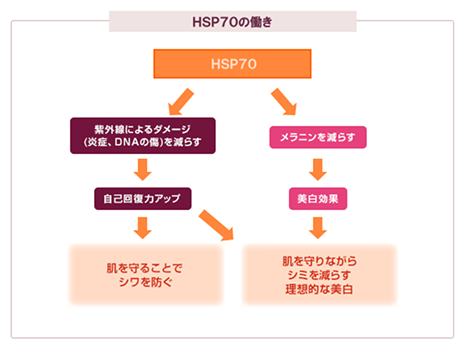 HSP70は、世界で初めてシワとシミの両方を防ぐことが明らかになったタンパク質なのです。