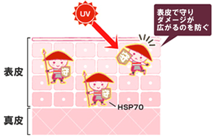 もう一つ注目すべきなのは、HSP70がたくさんある「場所」です。HSP70は体の様々な場所にあるのですが、肌では、特に「表皮」にたくさんあることが分かりました。この表皮は、体の外側に位置するため、紫外線ダメージを最も受けやすい場所なのです。紫外線は、表皮にあたると炎症反応を引き起こし、内側にある真皮にまでダメージを伝えてしまいます。表皮にあるHSP70は、この炎症反応のスタートを小さくすることで、真皮へのダメージを減らしてくれるのです。