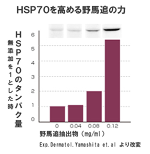 野馬追のHSP70への効果実験を行った結果、野馬追が「HSP70」を増やすことが分かり、さらに遺伝子レベルからもHSP70を増やすことが確認されました。HSPを高める成分としては、胃潰瘍(いかいよう)の薬でGGA(Geranylgeranylacetone)という合成の薬がありますが、 天然原料から同等の効果を見つけ出したのは、初めてのことです。「天然原料で肌本来の力を引き出す」という私たちが理想とする素材に辿り着いたのです。