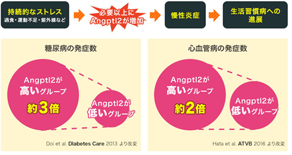 - アンジオポエチン様因子2。組織の修復に重要なタンパク質だが、過剰に分泌されると慢性炎症を引き起こし、老化を促進したり、糖尿病や動脈硬化、がんといった生活習慣病の発症・進展に関与する