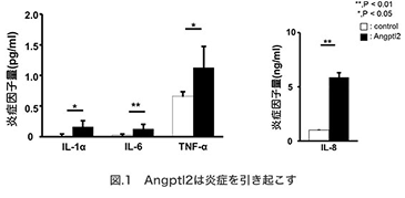 - アンジオポエチン様因子2。組織の修復に重要なタンパク質だが、過剰に分泌されると慢性炎症を引き起こし、老化を促進したり、糖尿病や動脈硬化、がんといった生活習慣病の発症・進展に関与する