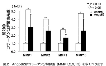 私たちはAngptl2が多い肌でどのようなことが起きているか調べるために、Angptl2が多い細胞と通常の細胞を用いて、様々な遺伝子の発現状態を調べました。その結果、Angptl2が多い細胞では、紫外線を浴びた時と同様に多くの炎症反応が起こっており(図1)、コラーゲンを分解してしまう酵素が増加していることが分かりました(図2)。