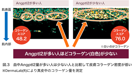 実際に、Angptl2量と皮膚のコラーゲン量の関係を調べたところ、Angptl2量が多い人ほど、コラーゲン密度が低下していることが確認されました。
