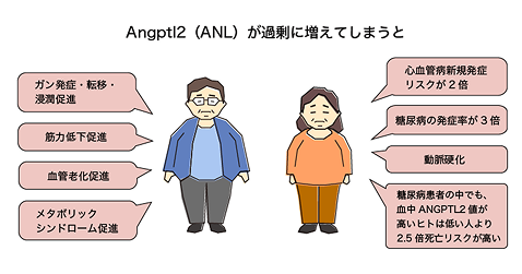 Angptl2(ANL)は、壊れてしまった組織の修復にも関わる、身体に必要なタンパク質です。しかし、加齢・ストレス・運動不足・過食・紫外線などが原因でAngptl2(ANL)が増えてしまい、その結果、体の中で小さな炎症が継続的に引き起こされることで(慢性炎症)、ガンの発症・進展や糖尿病、動脈硬化といった生活習慣病にまで発展してしまうことが分かっています。