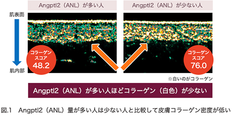 Angptl2(ANL)が紫外線や睡眠不足、過食などで必要以上に増えてしまうことで、角質が肥厚したり、身体のサビと言われている活性酸素の増加、肌の弾力を生み出すコラーゲンを分解してしまう酵素が増えることが分かりました。実際に、Angptl2(ANL)量と皮膚のコラーゲン量の関係を調べたところ、Angptl2(ANL)量が多い人は、コラーゲン密度が低下していることが確認されました。