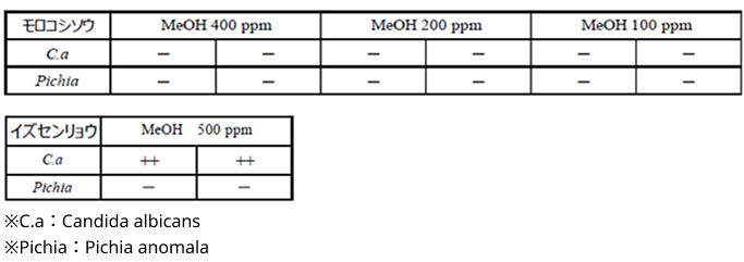 モロコシソウ・イズセンリョウのMeOH抽出物を使用し、(2)のモロコシソウ地上部の抽出物(a)と、同様の方法で抽出したイズセンリョウ地上部の抽出物(b)を使用し、どの種類の真菌に効果を発揮するか検討しました。結果、モロコシソウ抽出物において、C.a、Pichia ともに100ppmでP.p に対して完全抑制が確認され、イズセンリョウ抽出物においては、Pichia のみ500 ppmで完全抑制が確認されました。