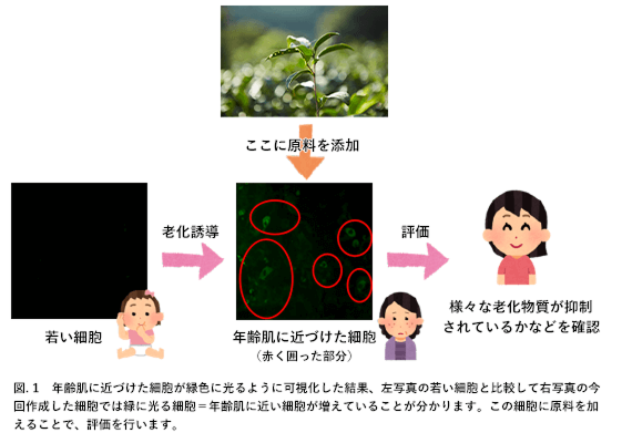 再春館製薬所では『年齢肌』に効果があるかを追求しています。今回、年齢肌を模した、老化した細胞を樹立し、独自の評価システム『SAS system(SAISHUNKAN Aging selection system)』を確立しました(図.1)。このシステムを用いて原料評価を行うことで、年齢肌に効果のある原料の選定が可能になります。