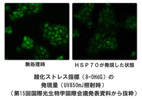 まず私たちは、HSP70が肌を保護しているか調べました。肌で最も重要なストレスのひとつは紫外線であると言えます。私たちは表皮に存在するHSP70(ヒートショックプロテイン70)に着目して、 紫外線ダメージをHSP70が抑制できるか研究を進めました。こちらの写真は無処理の細胞とHSP70が存在する細胞に対し、紫外線B波によるダメージを測定した結果です。 ダメージを受けた細胞は緑の蛍光で示されており、HSP70の存在で、紫外線ダメージが抑制されていることが確認できます。紫外線ダメージからの修復が不十分であると、細胞の機能が衰え、肌の悩みも加速してしまいます。HSP70は紫外線ダメージからの保護について重要な役割をしていることが分かりました。