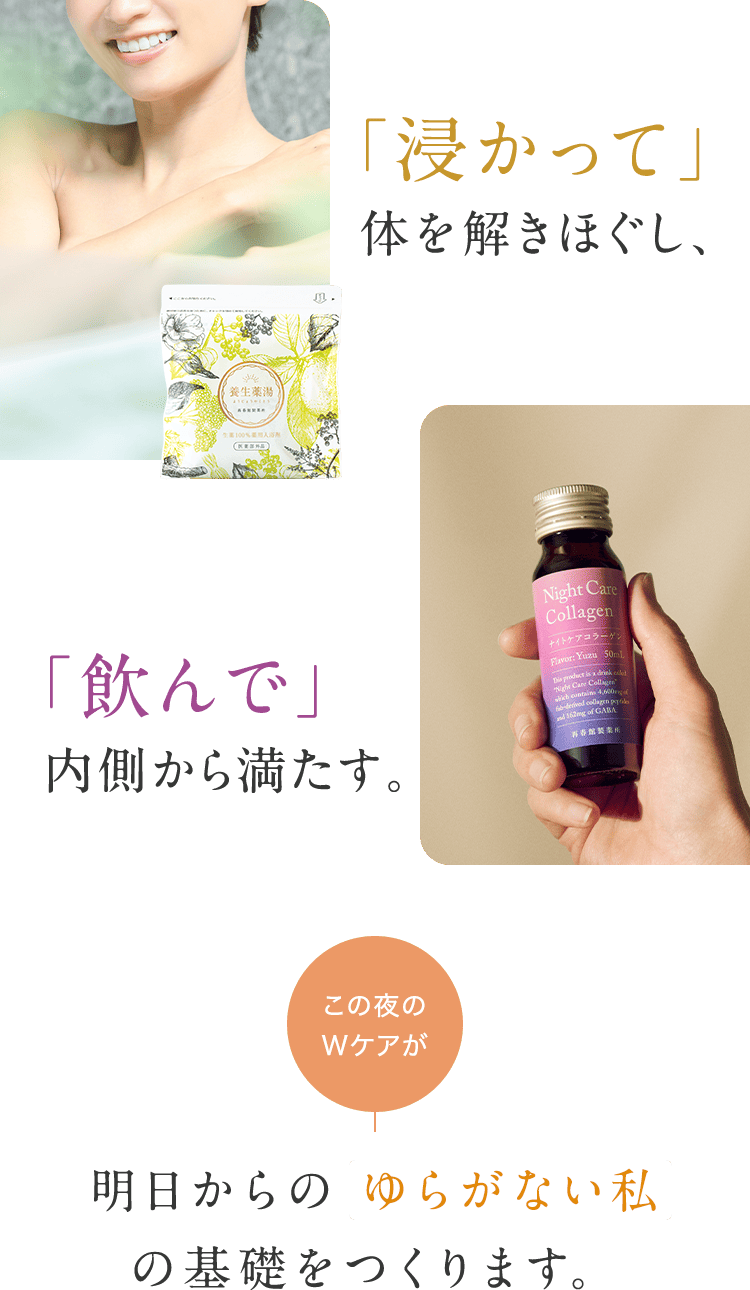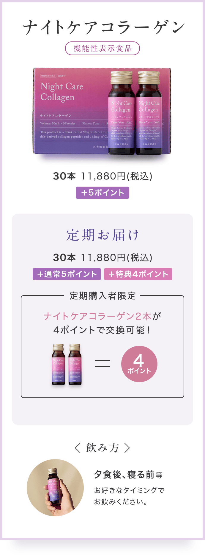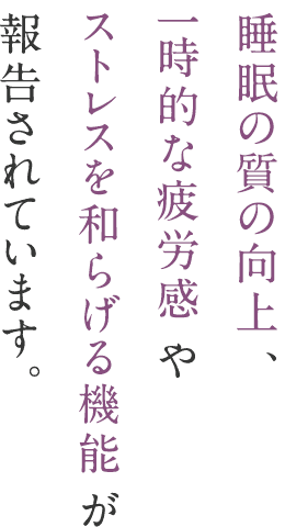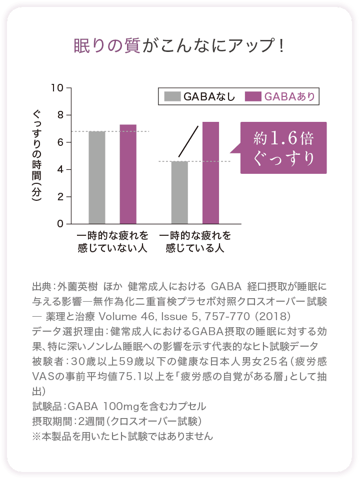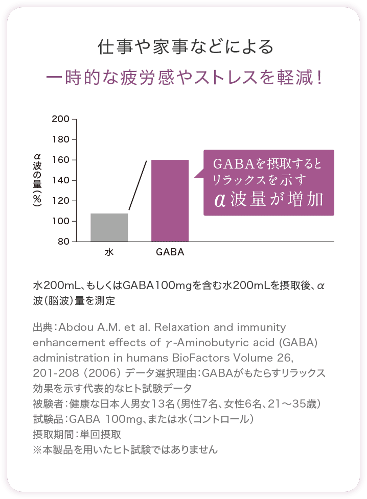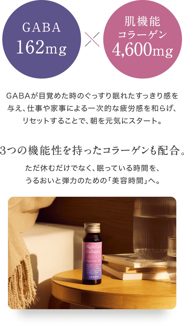 本品には魚由来コラーゲンペプチド、GABAが含まれます。魚由来コラーゲンペプチドには、肌の潤いを維持し、肌の健康に役立つ機能、肌弾力が低下している中高年の方の肌弾力を維持し、肌の健康に役立つ機能、紫外線により肌が赤くなりやすい方の肌を紫外線刺激から保護するのを助ける機能があることが報告されています。GABAには、睡眠の質(眠りの深さ)の向上に役立つ機能、仕事や家事などによる一時的な疲労感やストレスを和らげる機能があることが報告されています。